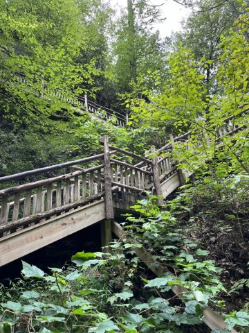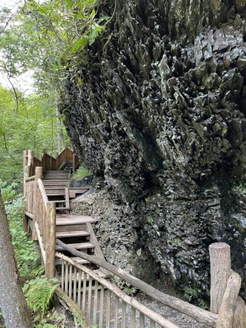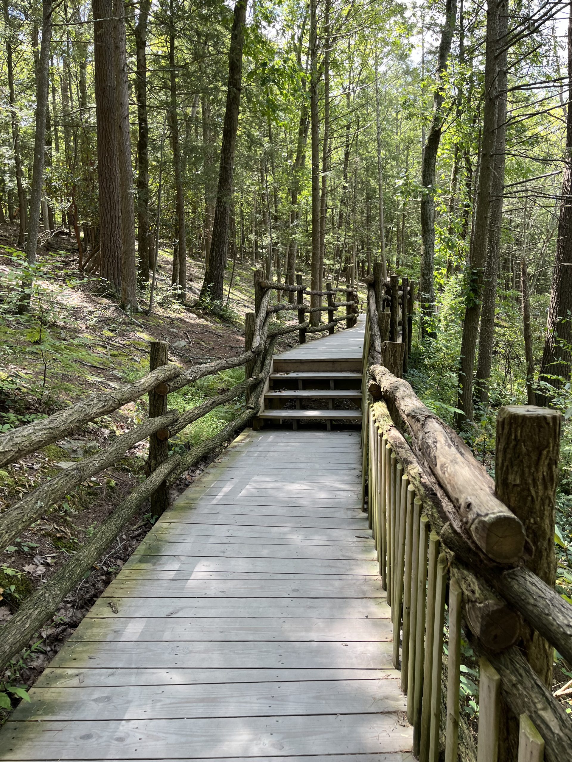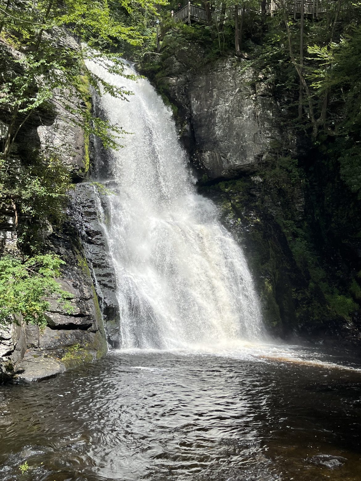 Bushkill Falls offers color-coded trails, each with differing in scenery, length, and challenge. It’s important to note that all the trails involve steps and stairways, and are not advised for people with limited mobility. In addition the trails are not wheelchair or stroller accessible. However, there is Dingmans Falls in the Nearby NPS Delaware Water Gap National Recreation Area that offers a flat boardwalk trail to its namesake beautiful natural cascade — the second highest waterfall in Pennsylvania.